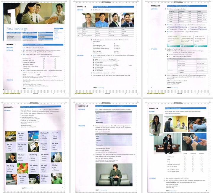 The first books covers the essentials of Business English; first meeting, company activities, visiting a client, routines activities, appointment, requests and offers, company history, making plans, options and preferences, direction, and invitations, entertaining and goodbyes,